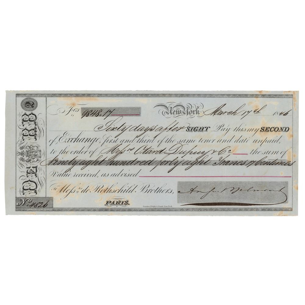 Partly-printed DS, one page, 9.75 x 4.25, March 17, 1846. Sight draft nicely signed by Belmont, in part: "Sixty days after Sight Pay this my Second of Exchange, first and third of the same tenor and date unpaid, to the order of Messrs. Otard Dupuy & Co. the sum of Ninety eight hundred forty eight Francs 17 centimes." In fine condition.
