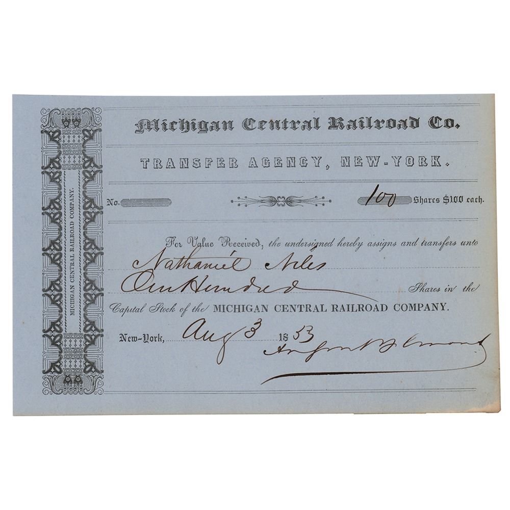 Partly-printed DS, one page, 7.75 x 5.25, August 3, 1853. Michigan Central Railroad Company transfer document assigning 100 shares to Nathaniel Niles. In fine condition.
