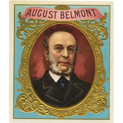 <B><I>August Belmont</B></I>,</B></I> <B>Famous Diplomat and Sportsman, Cigar Label.</B></I> A lithographed outer label of 4" x 4.75" showing Mr. Belmont's portrait surrounded by an elaborately gold embossed decorative border on a light blue background. August Belmont Sr. was born in Prussia and emigrated to New York City after becoming the American representative of the Rothschild family's bank in Frankfurt. He became a citizen and married the daughter of the legendary naval hero Commodore Matthew Perry. After working in the diplomatic corps, he became very active in Democratic Party politics becoming chairman of the party in 1860. An avid sportsman, he financed the building of Jerome Park in the Bronx where the now-famous annual Triple Crown race the Belmont Stakes was first run. This handsome example of cigar label art likely dates from the 1890s period and should appeal strongly to turf fans as well as label collectors. Near mint condition.<BR><BR><b>Shipping:</b> Small Flat (<a target="_blank" href="http://www.heritageauctions.com/common/shipping.php">view shipping information</a>)