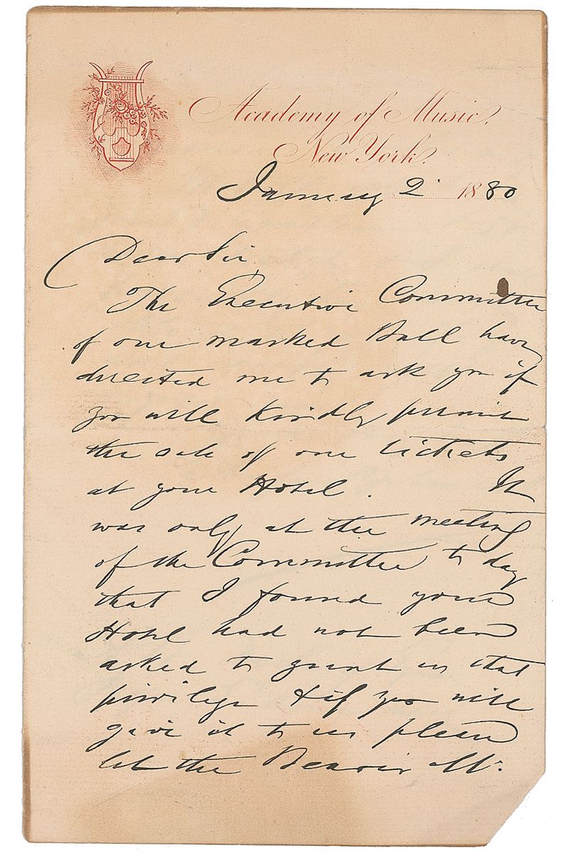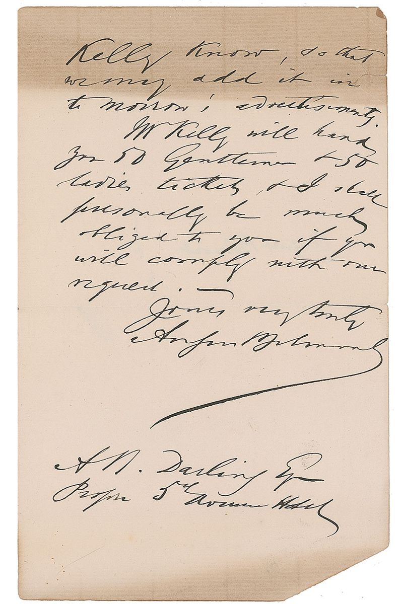 Politician and banker (1813–1890). ALS, two pages on two adjoining sheets, 5 x 8, Academy of Music letterhead, January 2, 1880. Letter to A. N. Darling, proprietor of the 5th Avenue Hall in New York. In part: “The Executive Committee of our masked ball have directed me to ask you if you will kindly permit the sale of our tickets at your Hotel.” In very good condition, with intersecting folds, clipped lower right edge, and scattered areas of toning.