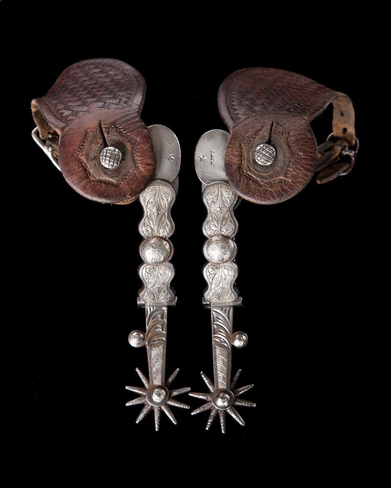 Mint condition straight shank California style spurs with full inlay on one side, deeply chased and cast off-side. The early marks, Pat’d H Hand Forged Steel all sharp and clear. Chased rowel tips, roll chap guard and cross hatch strap buttons holding H. H. Heiser basketstamped straps. Catalog number 03.