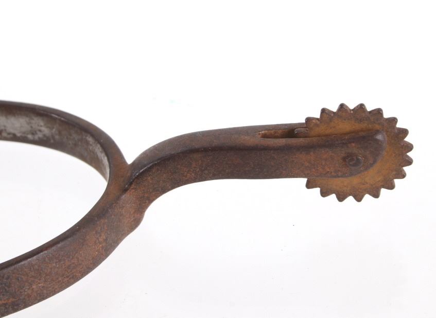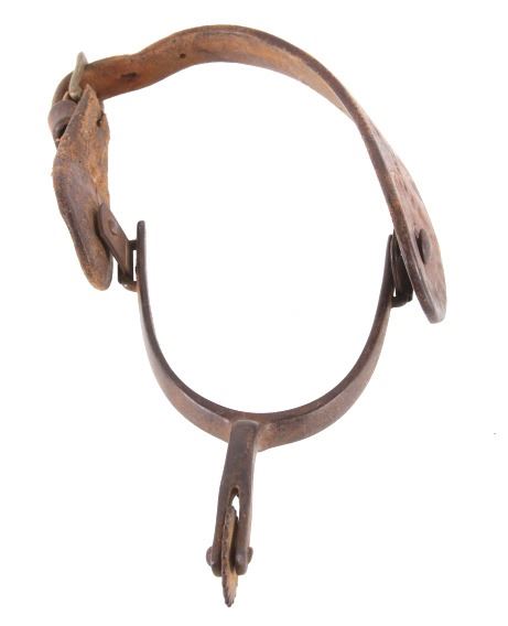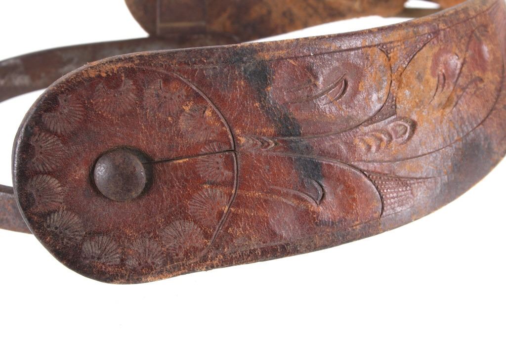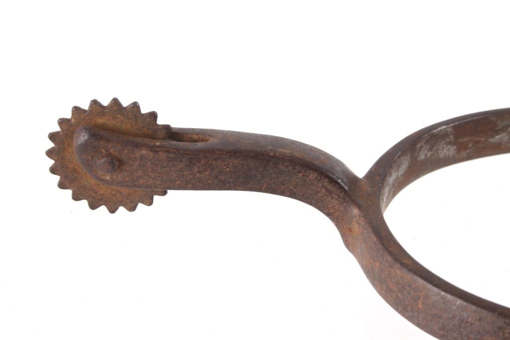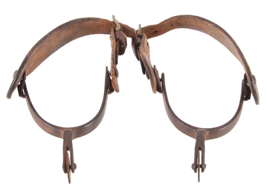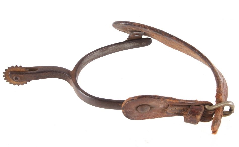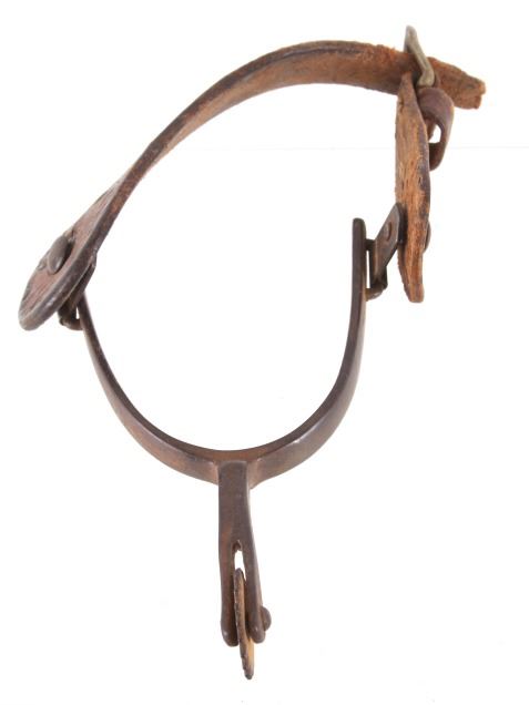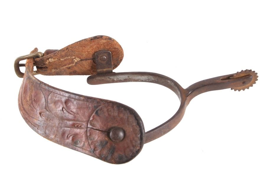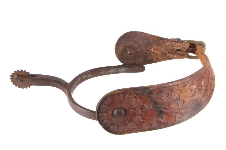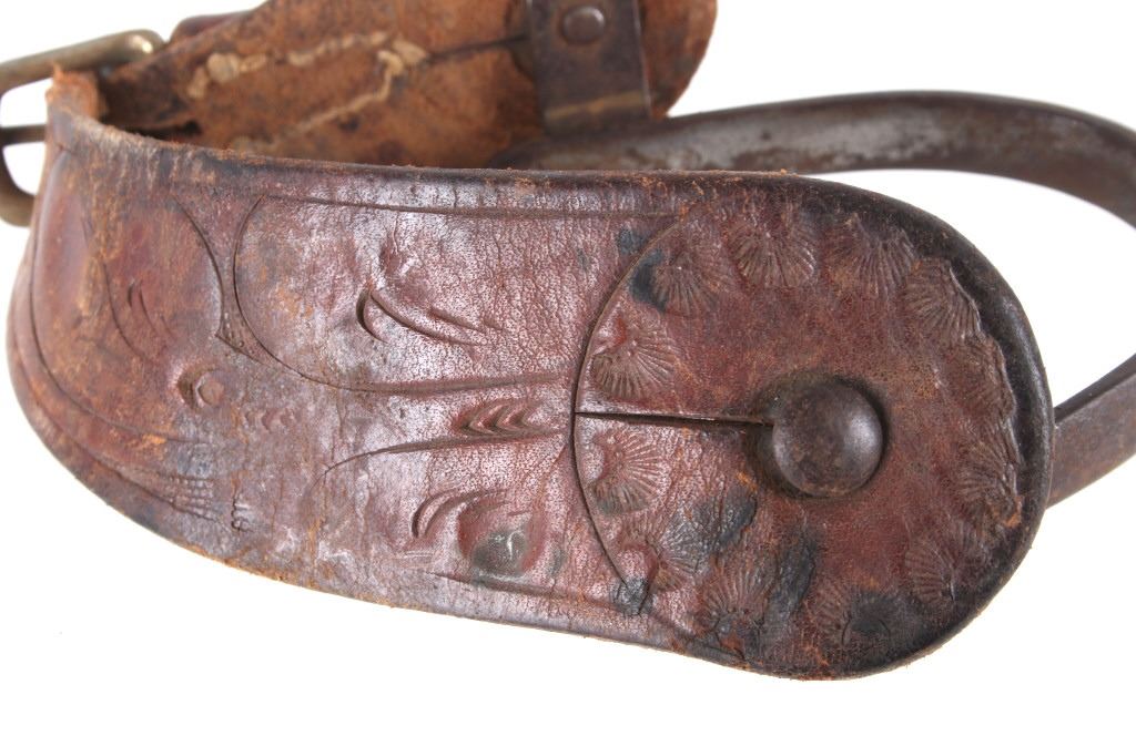 Featured in this lot is this August Buermann star marked raised shank spurs, circa 1890-1910. The spurs are really well constructed with a 19 tin sunburst rowel and swivel spur strap buttons; both spurs show early tooled spur straps. August Buermann immigrated to the US from Germany in 1864. After fighting in the Civil War, Buermann returned to New Jersey, where he went to work at Alexander Barclay’s company. Buermann bought out Barclay and, over the next 60 years, Buermann’s company produced the most complete catalog of bits and spurs of any company in the US, producing as many as 441 spur styles and 496 bit patterns. Many of these styles were original designs that were patented. The condition of these spurs is good, with great shape and oxidation consistent with the age of the spurs; the spur straps show wear consistent with age and one of them shows the tip of the male end broken. The measurements of these spurs are 1 1/2" x 5 3/4" x 4 1/4".