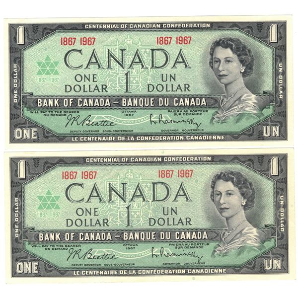 1967 Bank of Canada One Dollar Bills - Two - No Serial Numbers