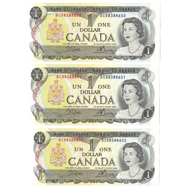 1973 Bank of Canada One Dollar Bills - Three Consecutive BCB8388650-652