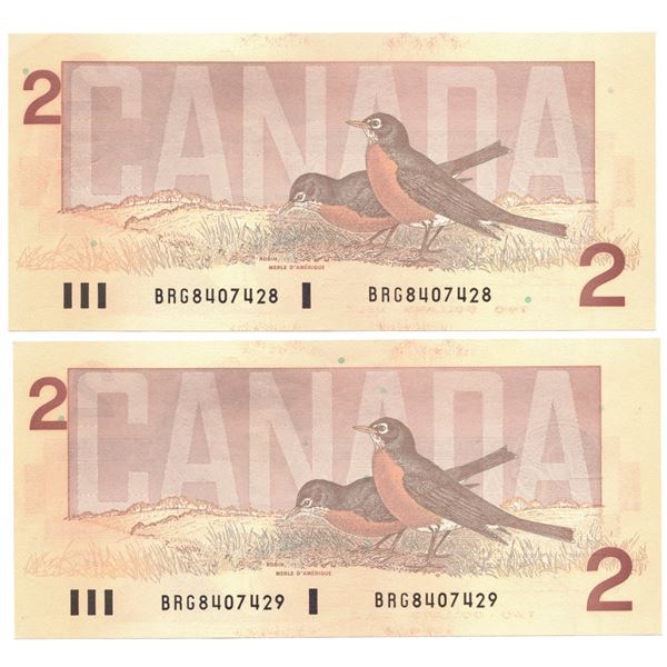1986 Bank of Canada Two Dollar Bills - TWO Consecutive BRG8407428-429