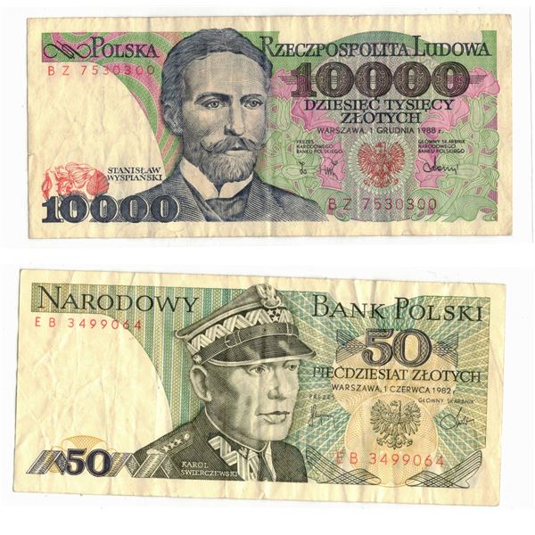 Polish Bills, 1982 50 Zeotych, 1988 10000 Zeotych