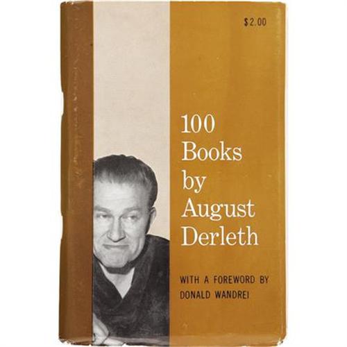 <B>[August Derleth]. </B></I><B><I>100 Books by August Derleth</B></I></B></I><B>.</B></I> Forward by Donald Wandrei. Sauk City: Arkham House, 1962.<BR> <BR>First edition. Small twelvemo. 121 pages.<BR><BR>Pictorial wraps and staple bound. Slight wear to the edges of the covers. Contents bright. Very good. <I>From the Robert and Diane Yaspan Collection.</B></I><BR><BR><b>Shipping:</b> Books & Catalogs (<a target="_blank" href="http://www.heritageauctions.com/common/shipping.php">view shipping information</a>)