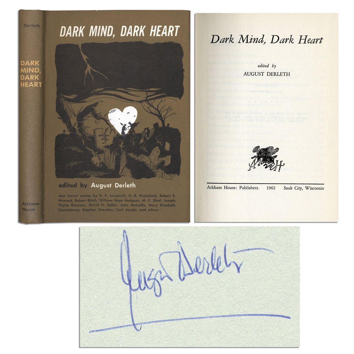 First edition of ''Dark Mind, Dark Heart'' signed by August Derleth. One of only 2,493 first edition copies printed by Arkham House: Sauk City, Wisconsin: 1962. Signed in blue ink on the front free endpaper, ''Sincerely, August Derleth''. This collection of short stories by various horror writers including H.P. Lovecraft is a classic example of Derleth's anthologies. ''Dark Mind, Dark Heart'' is also notable for including the first Cthulhu Mythos story by Ramsey Campbell. This 5'' x 7.25'' volume is in exceptional, near fine condition.