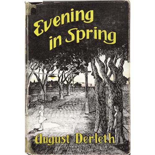 <B>August Derleth. </B></I><B><I>Evening in Spring</B></I></B></I><B>.</B></I> Sauk City: Stanton and Lee, 1945.<BR> <BR>First edition by this publisher after the 1941 Charles Scribner's Sons first publication. Octavo. 308 pages.<BR><BR>Publisher's black cloth with titles in gilt and light green on the spine and front board. Corners lightly bumped. Shelf wear to the extremities. Contents toned, as usual, especially at the pastedowns. Price-clipped dust jacket with loss at the head of the spine panel and general shelf wear and soiling. Very good. <I>From the Robert and Diane Yaspan Collection.</B></I><BR><BR><b>Shipping:</b> Books & Catalogs (<a target="_blank" href="http://www.heritageauctions.com/common/shipping.php">view shipping information</a>)