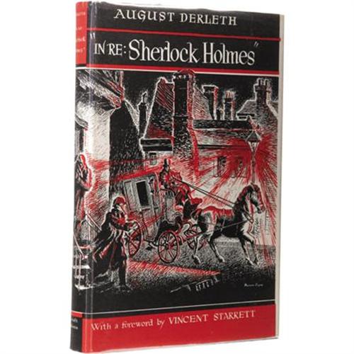 <B>August Derleth: <I>In Re: Sherlock Holmes</B></I>.</B></I> (Sauk City: Mycroft & Moran, 1945), first edition, 238 pages, black cloth with red lettering on spine, 12mo (5.25" x 7.5"), price-clipped dust jacket (in protective Mylar). Foreword by Vincent Starrett. <B>Condition</B></I>: Fine, with minor edge wear to the bottom edge. Previous owner's signature on front free endpaper.<BR><BR><b>Shipping:</b> Books & Catalogs (<a target="_blank" href="http://www.heritageauctions.com/common/shipping.php">view shipping information</a>)