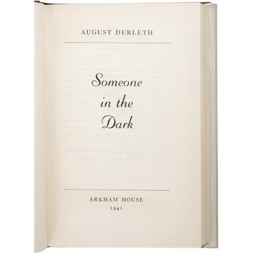 <B>August Derleth: Inscribed First Edition of<I> Someone In the Dark.</B></I></B></I> (Sauk City: Arkham House, 1941), first edition, 335 pages, inscribed by the author on the ffep, jacket by Frank Utpatel, black cloth with gilt titles, no headband, 12mo (4.75" x 7"), slightly bumped corners, else fine in a fine unclipped jacket. <I>From the Ventura Collection.</B></I><BR><BR><b>Shipping:</b> Books & Catalogs (<a target="_blank" href="http://www.heritageauctions.com/common/shipping.php">view shipping information</a>)
