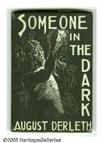 <B>August Derleth -- "Someone in the Dark," First Edition (Arkham House, 1941).</B></I> One of Arkham House's early publications, this volume is from a print run of 1,115 copies. It is in Very Good condition, with light edge and corner wear to the dust jacket, uniform staining to the back panel of the jacket, a clipped price, a store sticker on the inside front board, and light chipping to the top and bottom of the jacket spine.
