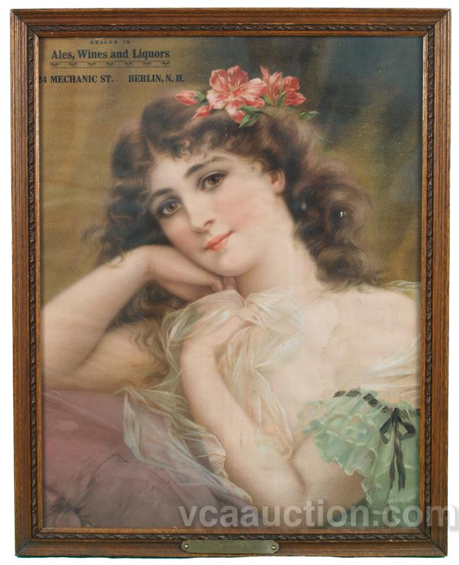 August Koch & Sons Paper Advertisement - Dealer In Ales, Wines & Liquors picture of lady, 24 Mechanic St., Berlin N.H. - framed 15" x 20"
