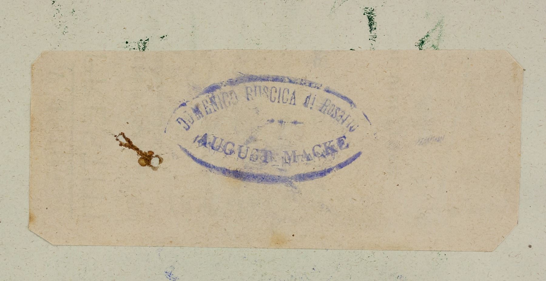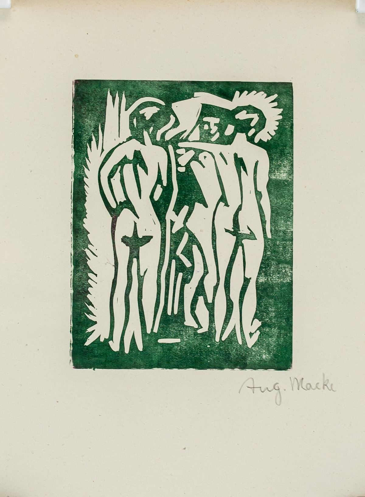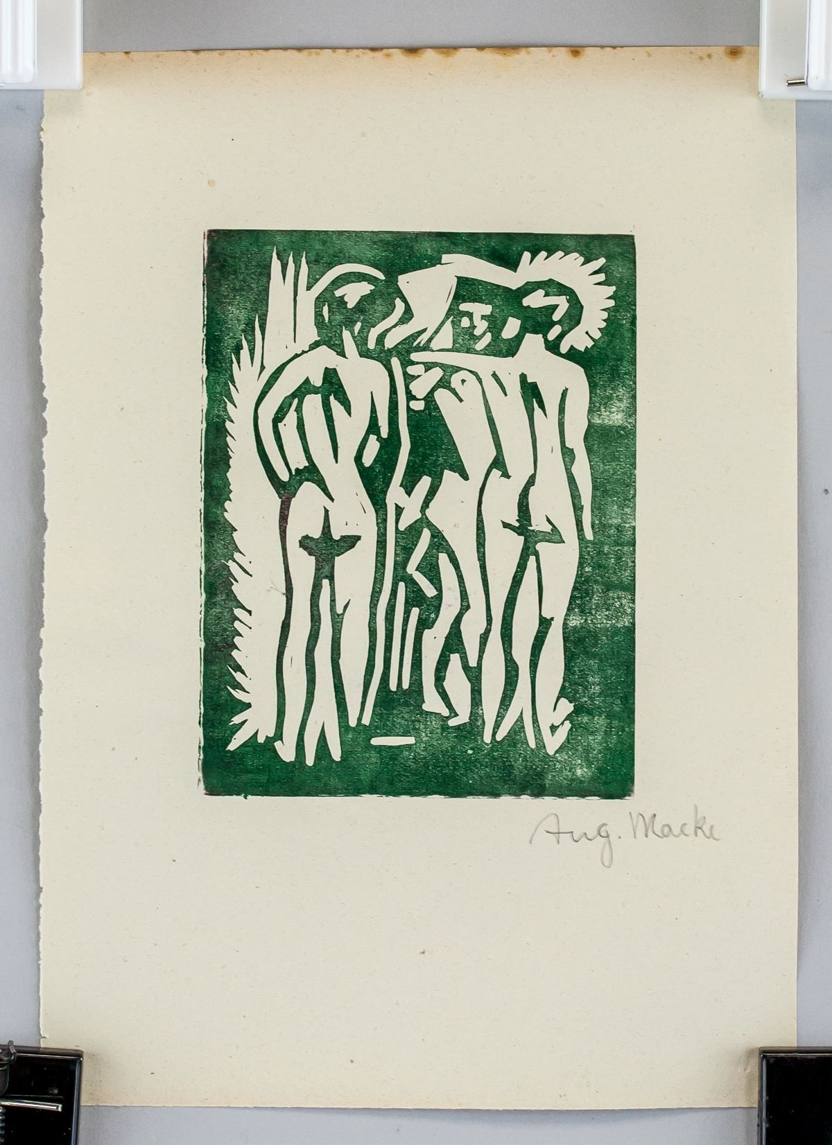 Woodcut on paper. Featuring several nude figures. Signed Aug Macke on the lower right corner. Stamped DOMENICO BUSCICA di ROSARIO AUGUSTE MACKE on verso. Attributed to August Macke (1887-1914, German). 22 x 16 cm (8.5 x 6.5 inches)