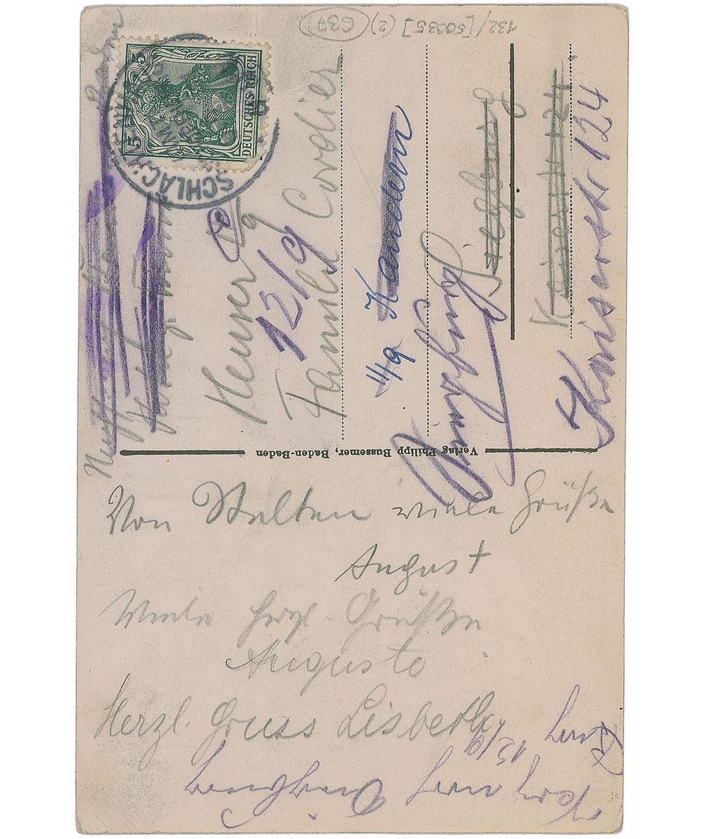 Painter and leading member of the German Expressionist group Der Blaue Reiter (1887–1914) who was killed at the front in Champagne, France, in 1914. ANS in German in pencil, signed “August,” one page on a 5.5 x 3.5 postcard depicting Kurhaus Stalten in the southern Black Forest, no date but postmarked 1911. A note to his family. In part (translated): “Greetings from Stalten.” Postcard bears additional pencil notes and several strikethroughs and emendations to the address area. In fine condition. The period he sent this postcard marked the beginning of the height of his career, during which he developed his distinct style by integrating several of the avant-garde movements.