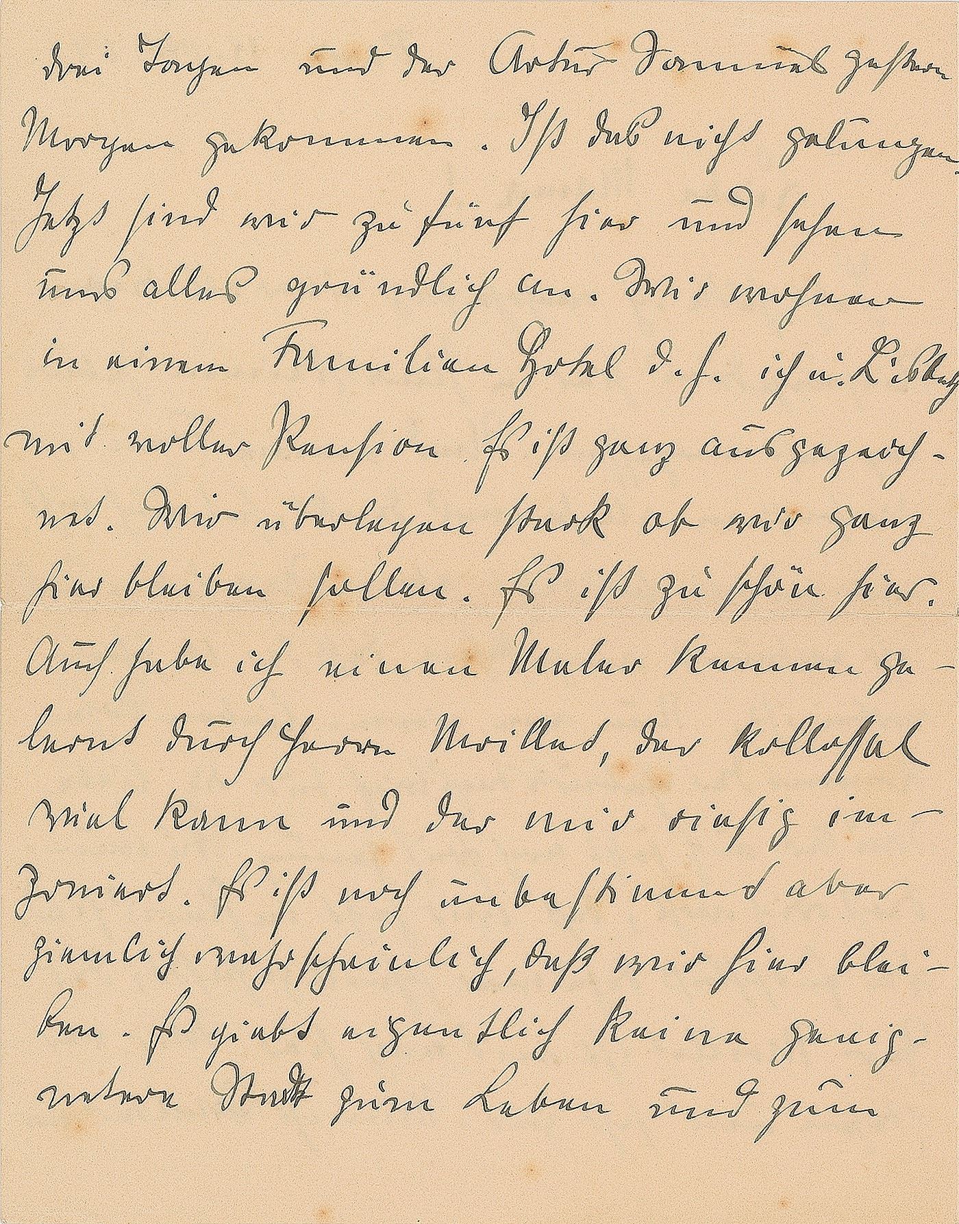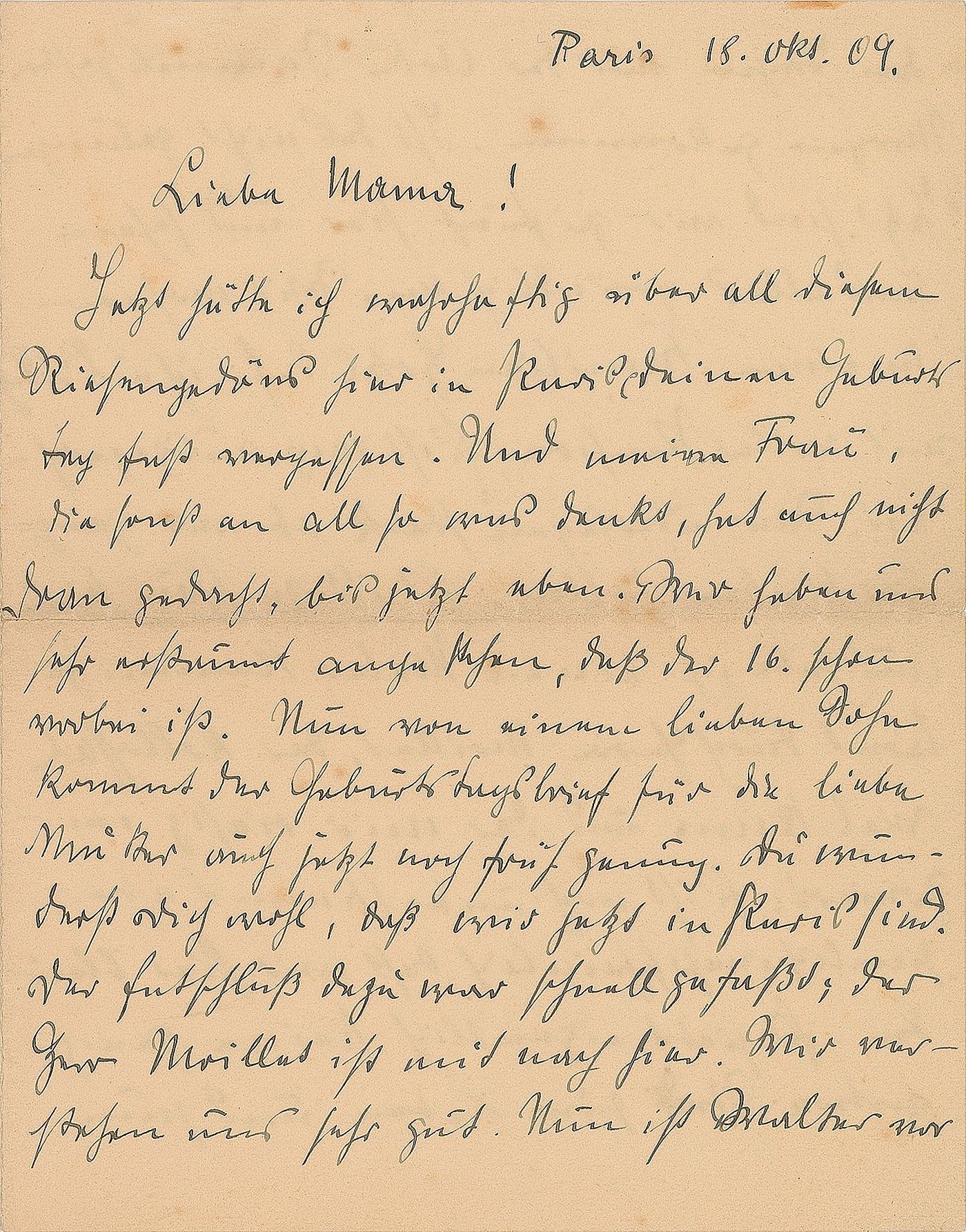 Painter and leading member of the German Expressionist group Der Blaue Reiter (1887–1914) who was killed at the front in Champagne, France, in 1914. ALS in German, signed “August,” three pages on two adjoining sheets, 5.5 x 7.25, October 18, 1909. Letter from his honeymoon in Paris addressed to his mother in Siegburg, sending late birthday greetings. On their trip via Frankfurt, Colmar, and Bern, the young couple was accompanied by their friend, the painter Louis Moilliet. In part (translated): "With all the fuss here in Paris, I have nearly forgotten your birthday. Even my wife, who normally thinks about this sort of thing, did not remember it, until just now. We have looked at each other in surprise realizing that the 16th is already past. The birthday letter for a dear mother by her loving son, however, will be early enough as it is. You will be surprised to learn that we are now in Paris. We decided this quite quickly: M. Moilliet is this accompanying us. We get along very well. Now, three days ago, Walter arrived, and yesterday, Artur came too. Isn’t that wonderful!…All is excellent. We are considering staying here for the whole time since it is just so beautiful. Besides, I have met a painter through M. Moilliet who is extremely good and to whom I look up. It is not sure, but quite likely that we will stay here. There really is no other city like Paris if it comes to living and painting. I think, Lisbeth has enjoyed herself, too. Only Walter has been telling us about the rest of the wedding, which seems to have been quite nice. We have been to Frankfurt, Colmar, Bern. In Bern, we have had a great time with Ms. Moilliet, wife of the colonel." Reverse of the final page bears an untranslated letter by his wife, Elisabeth. In fine condition, with a bit of light foxing. In October 1909, after having finished his requisite year of military service, Macke married Elisabeth Gerhardt. Their honeymoon led them to Paris, where Macke drew inspiration from the Fauves and the Futurists. Despite Macke's professed love of Paris, the couple soon moved to Tegernsee in Upper Bavaria, where he commenced a period of extreme artistic productivity.