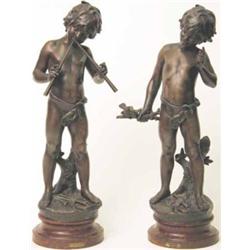 August Moreau, French circa 1890, a pair of spelter figures, each of a near naked infant, one blowing Pan pipes, the other raising one finger, each on simulated red marble base, 21 ins. £250-350