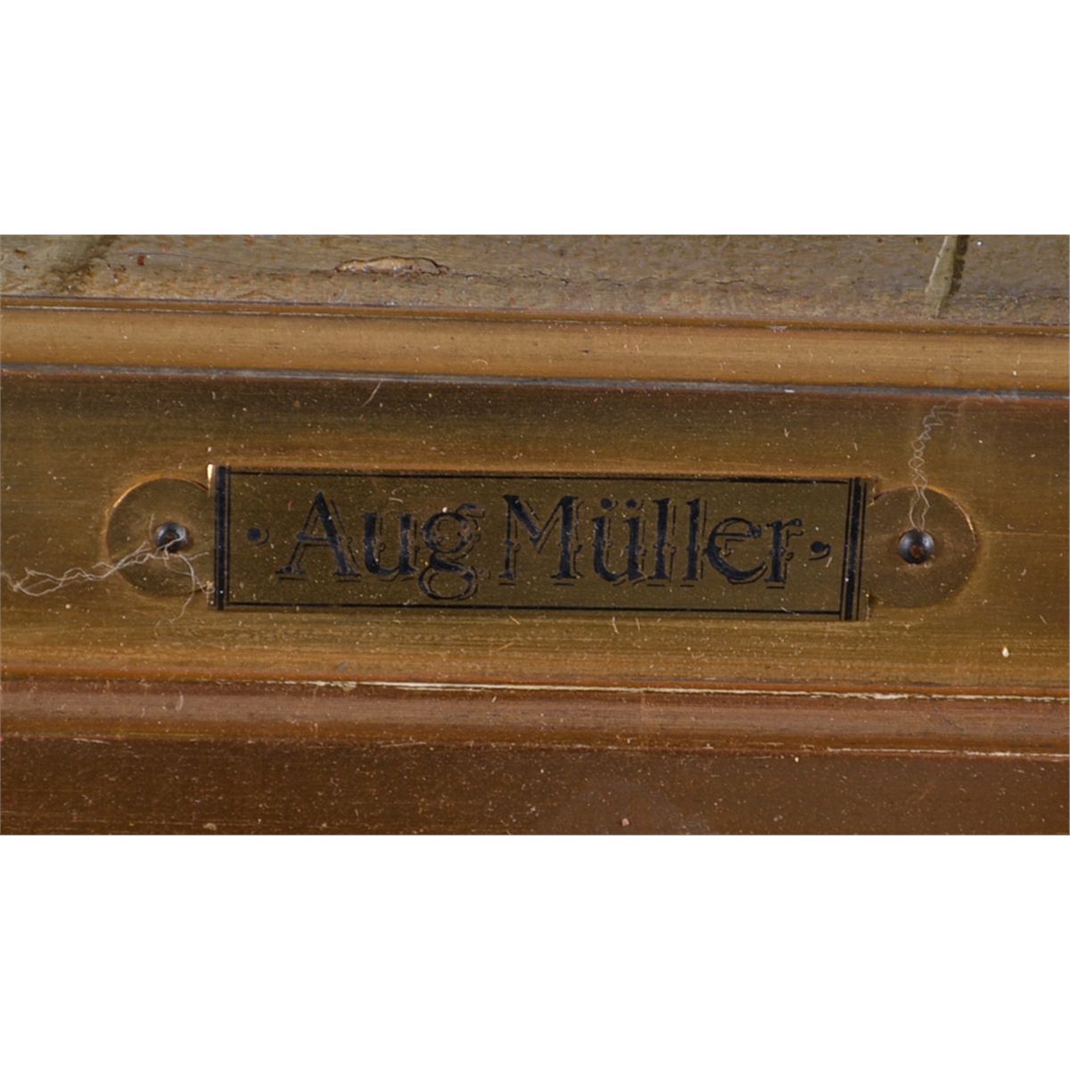 Finely painted to depict a mother with young daughter and baby in a cradle on a front porch, viewing her children lovingly. Signed in LR Aug. Muller and titled below signature illegibly. Nameplate Aug. Muller attached to front bottom of frame. Very well done with realistic details. August Muller (1836-1885), Germany, was known for his figural genre depictions. Framed in a gilt carved wood with flourettes, leafves and bow frame, 13" H x 10" W, sight, 24.75" H x 22" W, framed. Circa mid 19th century. Minimal losses to frame. Private collection St. Clair Shores, MI.