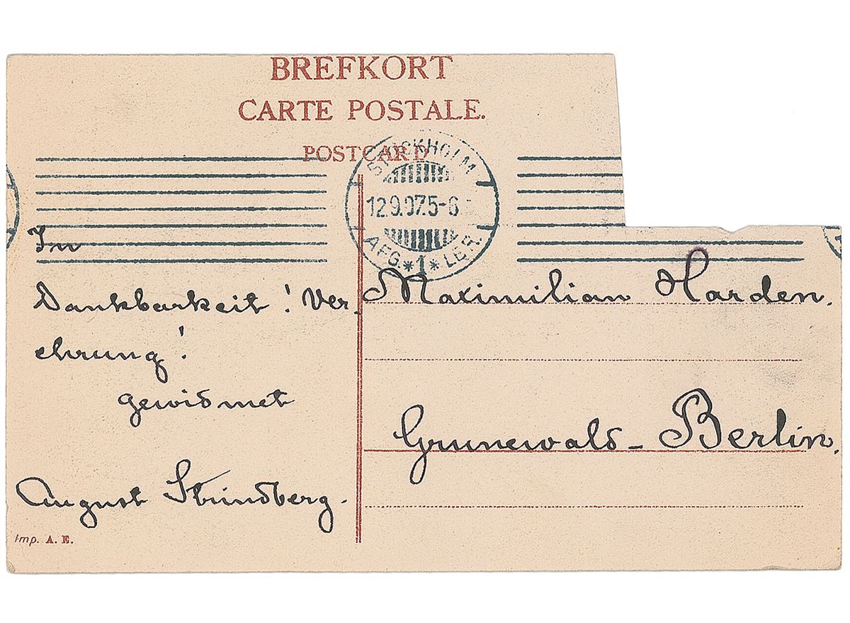 Important Swedish novelist and playwright (1849–1912) who takes a place among the most influential figures in the development of modern theater. Two postcards featuring identical photos of Strindberg, trimmed to 5.5 x 3.25, both sent to Maximilian Harden in 1912, with Strindberg penning brief greetings in German and signing at the conclusion. In very good to fine condition, with a significant diagonal crease to one card and aforementioned irregularly trimmed edges.