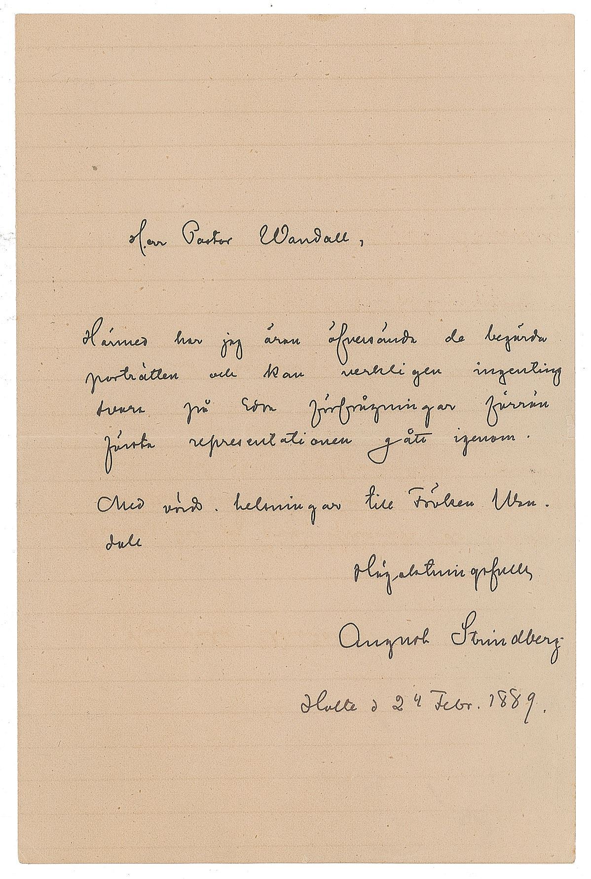 Important Swedish novelist and playwright (1849-1912) who takes a place among the most influential figures in the development of modern theater. ALS in Swedish, one page, 5.5 x 8.25, February 24, 1889. Letter to pastor and teacher Frederik Wandall (1849-1917) in Prestoe, replying to an inquiry about intended plays for Strindberg's experimental theatre in Copenhagen, where—because of Swedish censorship—his dramas, including 'Miss Julie,' were staged. The letter was written in Holte, where Strindberg spent the spring of 1889 in the mansion of renowned set designer Waldemar Gyllichs (1836–1895). In fine condition.