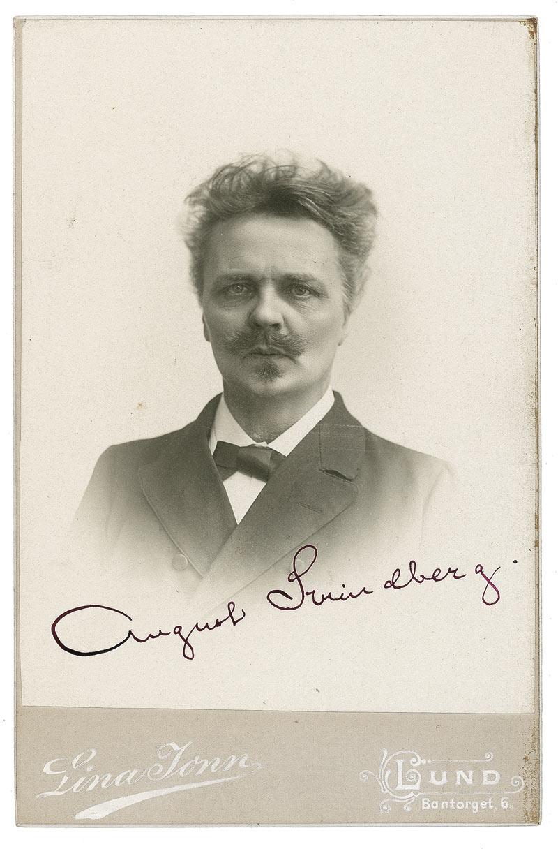 Important Swedish novelist and playwright (1849–1912) who takes a place among the most influential figures in the development of modern theater. His best-known works include Miss Julie, The Dance of Death, and A Dream Play. Superlative 4.25 x 6.5 bevel-edged cabinet portrait by Lina Tonn of Lund, showing Strindberg in a bow tie and a bearing a weary, acerbic look, boldly signed “August Strindberg” in red fountain pen. A bit of unobtrusive light residue along extreme right edge, otherwise fine condition. A rare signed photo, a priceless expression. Provenance: The Barry Hoffman Collection.