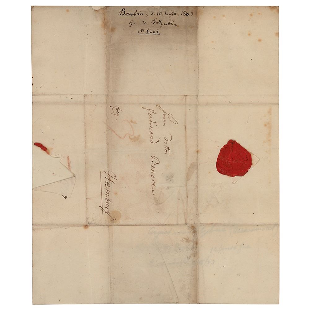 ALS in German, signed “Kotzebue,†one page, 8 x 9.75, September 10, 1803. Untranslated handwritten letter to lawyer and politician Ferdinand Beneke. In very good to fine condition, with scattered staining, overall wrinkling, and seal-related loss to the integral leaf.