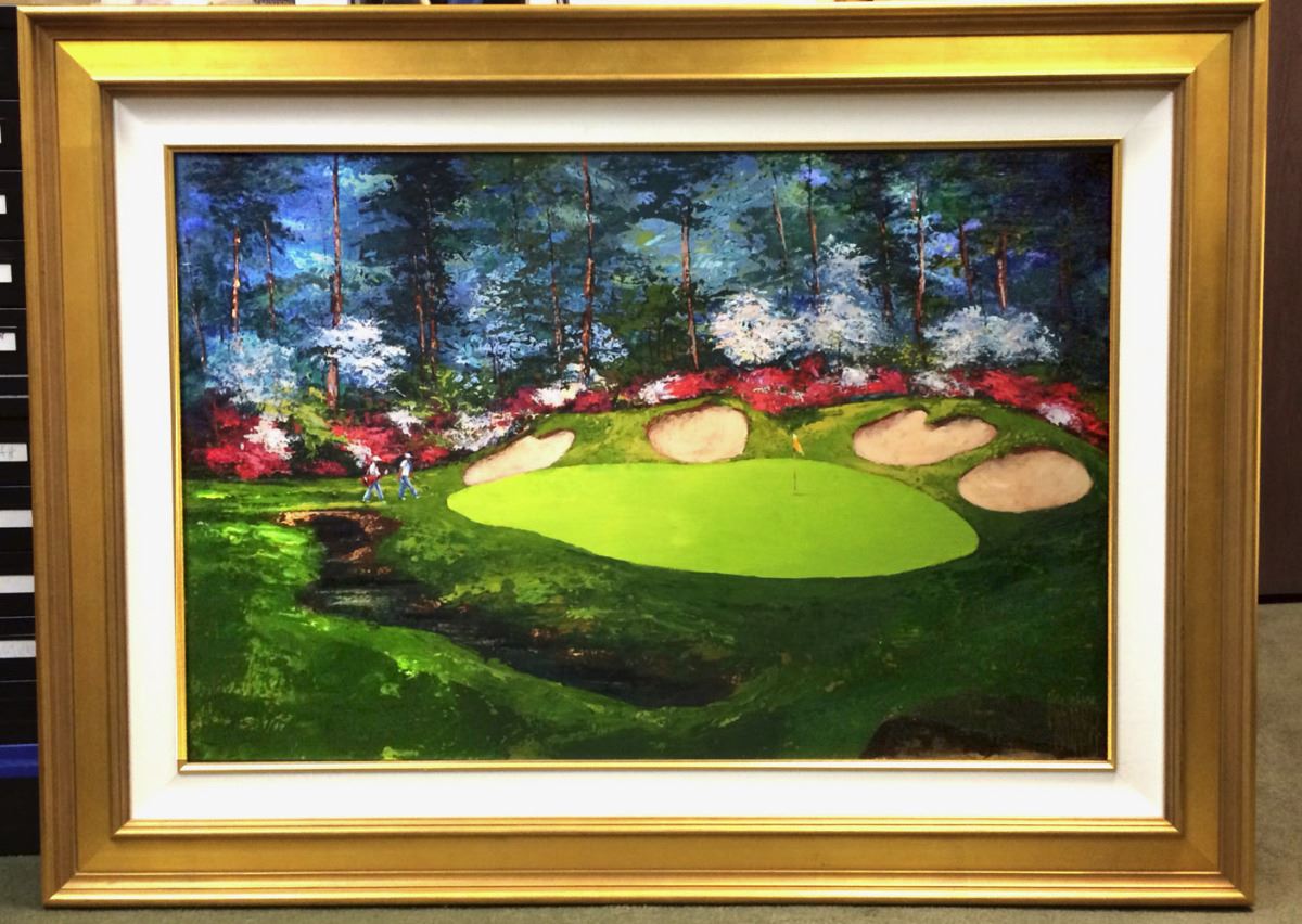 On one of Mark King's favorite golf courses, the Azalea Hole at Augusta National is well known to golf-fans worldwide as one of the very difficult three hole stretch on the course after which everyone says "Amen, I got through that !" This is a signed and numbered giclee # 9/99 from a very small limited edition that was still not completed before his death in 2014 . It measures 24x36" unframed and 34x46 in this beautiful gold frame with linen liner and gold wood filet . Shipping weight approx 25 lbs. Certificate available upon request.