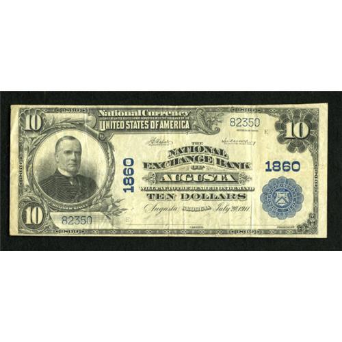 <B>Augusta, GA</B></I> - $10 1902 Plain Back Fr. 628 <B>The National Exchange Bank</B></I> Ch. # 1860<BR> This $10 has original surfaces and even wear. The signatures are faded, yet discernible. The officers are W.T. Wiggins and P.E. May. <B>Fine.</B></I><BR><BR><b>Shipping:</b> Coins & Currency (<a target="_blank" href="http://www.heritageauctions.com/common/shipping.php">view shipping information</a>)