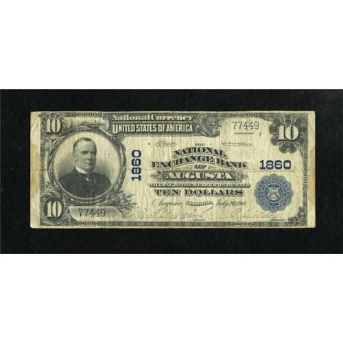 <B>Augusta, GA</B></I> - $10 1902 Plain Back Fr. 628 <B>The National Exchange Bank</B></I> Ch. # 1860<BR> The officers' signatures are still visible and the overprint is bright for the grade. There is a minor rust stain that is confined to the margin. <B>Fine.</B></I><BR><BR><b>Shipping:</b> Coins & Currency (<a target="_blank" href="http://www.heritageauctions.com/common/shipping.php">view shipping information</a>)