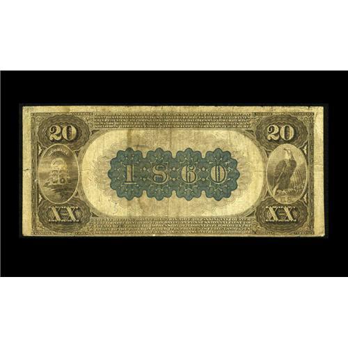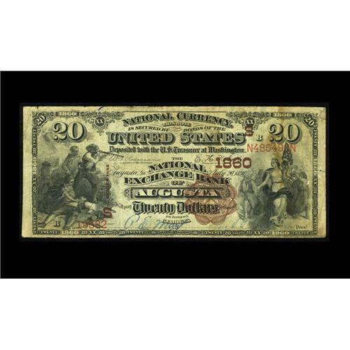 <B>Augusta, GA</B></I> - $20 1882 Brown Back Fr. 497 <B>The National Exchange Bank</B></I> Ch. # (S)1860<BR>A nice <B>Fine-Very Fine</B></I> example from the more available of the two banks located here to issue Brown Backs. A margin separation and some light staining are noted at the right, although the stamped blue signatures remain legible.