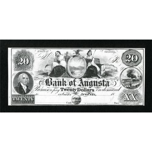 <B>Augusta, GA- Bank of Augusta</B></I> $20 18__ G98 Proof<BR> President James Monroe graces this <B>Crisp Uncirculated</B></I> Proof that is mounted on card stock and formerly part of the ABNCo archives.<BR><I>From The Collection of a Louisiana Gentleman</B></I><BR><BR><b>Shipping:</b> Coins & Currency (<a target="_blank" href="http://www.heritageauctions.com/common/shipping.php">view shipping information</a>)