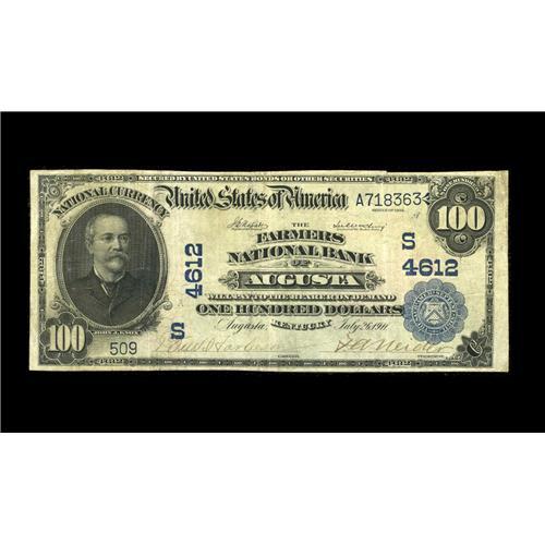 <B>Augusta, KY</B></I> - $100 1902 Date Back Fr. 693 <B>The Farmers NB</B></I> Ch. # (S)4612<BR>A scarce note both from this bank and from the entire state, where the census of known Kentucky $100 Date Backs from all banks combined stands at only 11 pieces. Pen signed <B>Fine-Very Fine,</B></I> a handsome note which is certain to please.