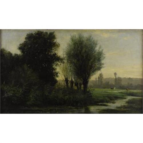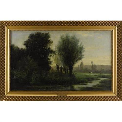 <B>AUGUSTE ALLONGE</B></I> (French 1833-1898)<B></B></I><BR><I>River Landscape with Grazing Cattle</B></I><BR>Oil on canvas laid on panel<BR>13 x 22 inches (33.0 x 55.9 cm)<BR>Signed lower left <I>Allonge Auguste</B></I><BR> <B>Condition Report:</B> <BR><BR><b>Shipping:</b> Requires 3rd Party Shipping (<a target="_blank" href="http://www.heritageauctions.com/common/shipping.php">view shipping information</a>)