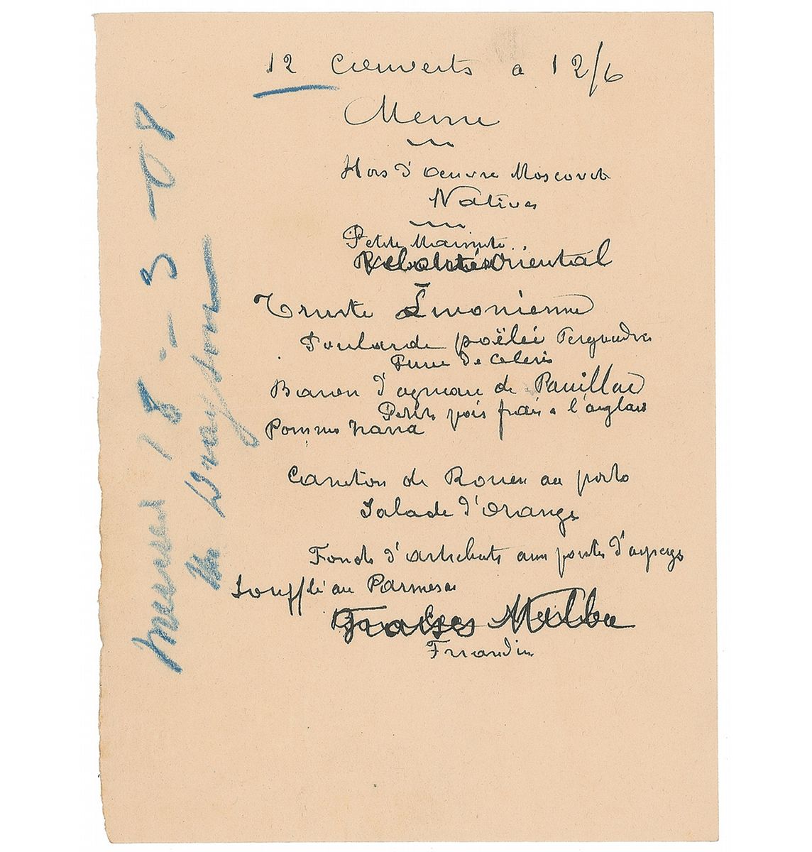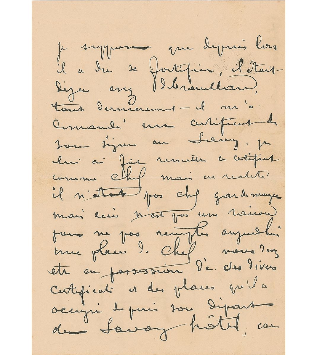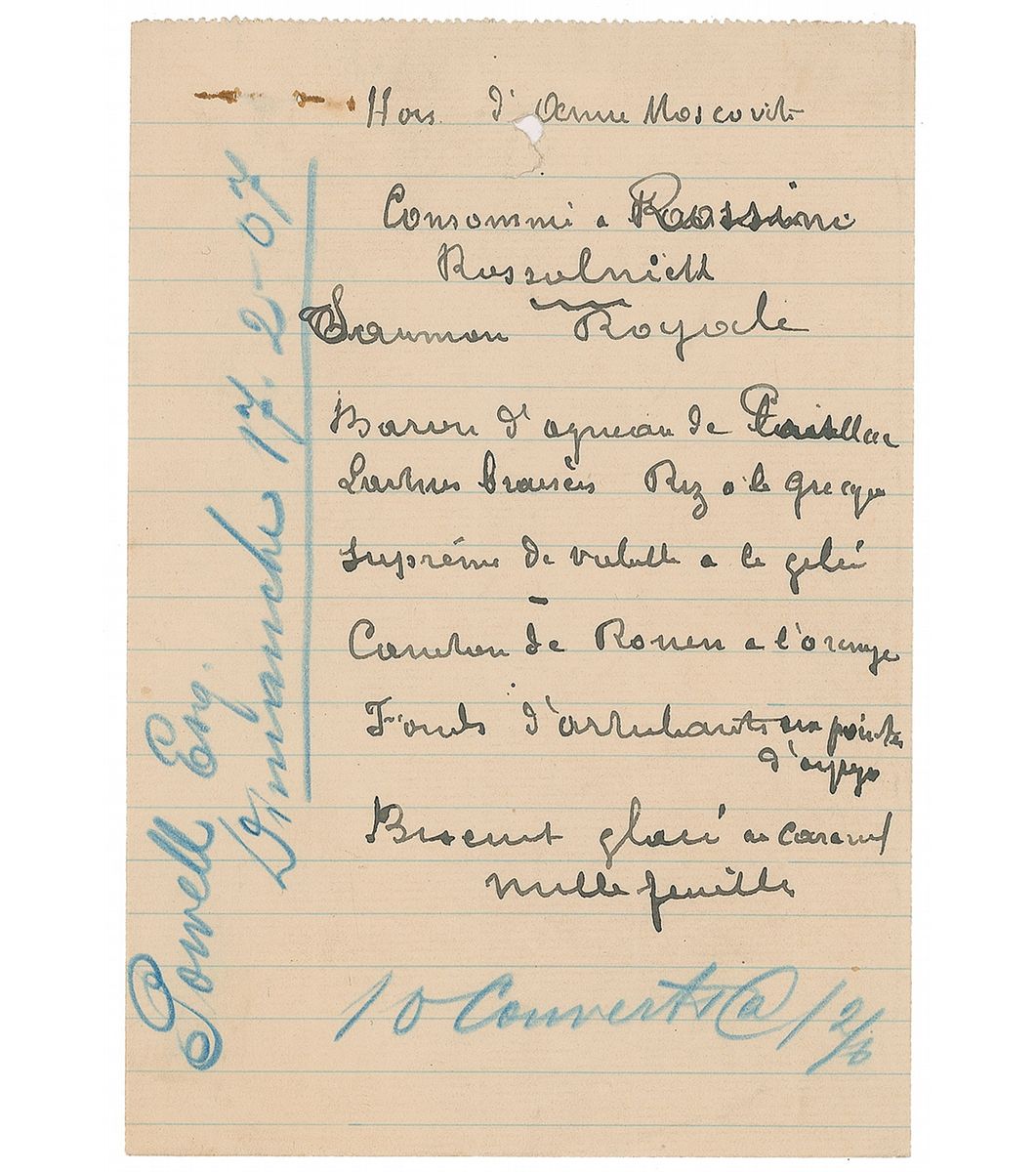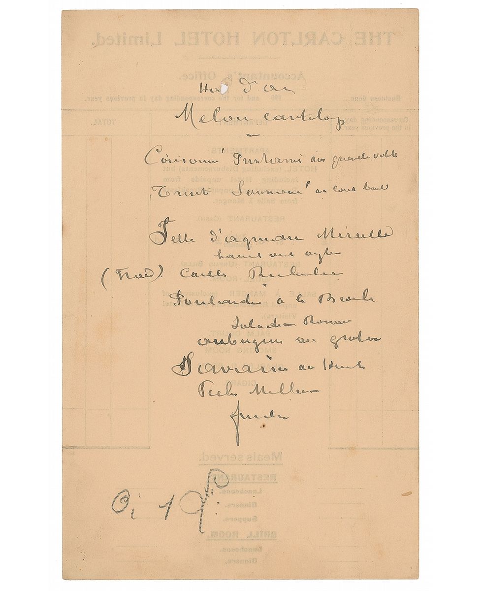 Legendary French chef, restaurateur, and culinary writer (1846–1935) who was one of the most important leaders in the development of modern French cuisine. ALS in French signed “A. Escoffier,” four pages on two adjoining sheets, 5 x 7, Carleton Hotel letterhead, June 2, 1903. Escoffier writes to a gentleman regarding a reference he has supplied for a former assistant at the Savoy; and four handwritten draft menus for private dinners presented by Escoffier, each one page, two annotated with the names of the hosts and dated 1907–1908. One lists selections such as “Consomme´ Rossini,” “Saumon Royale,” “Caneton de Rouen a l'orange,” and “Fonds d'artichauts.” In overall fine condition. Accompanied by two additional menus transcribed by one of his assistants.
