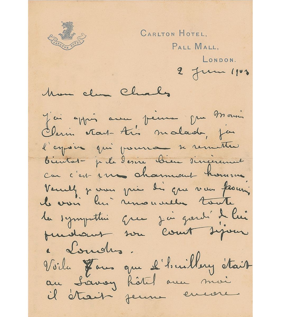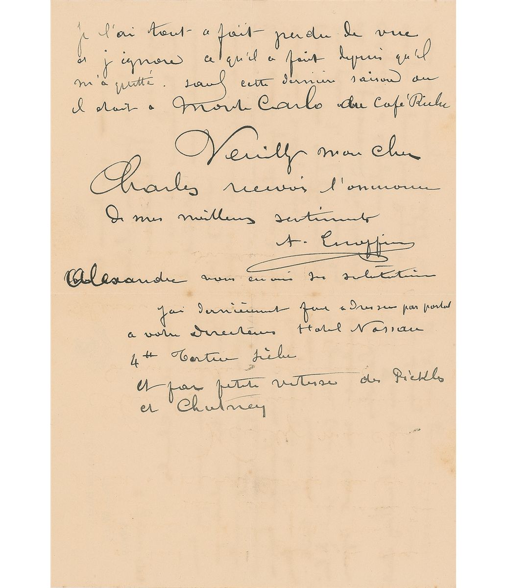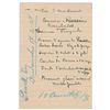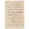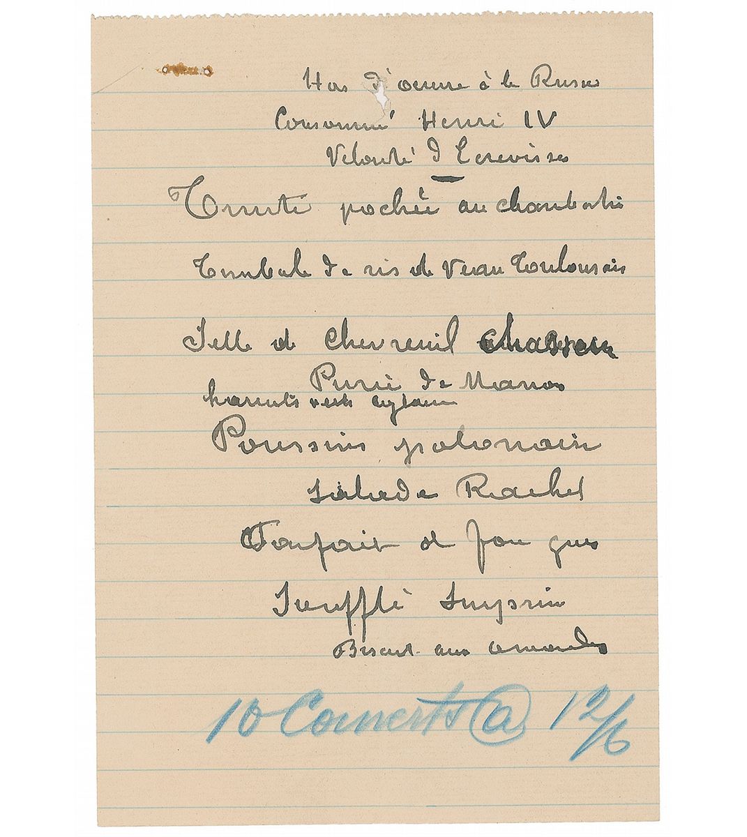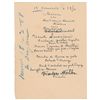 Legendary French chef, restaurateur, and culinary writer (1846–1935) who was one of the most important leaders in the development of modern French cuisine. ALS in French signed “A. Escoffier,” four pages on two adjoining sheets, 5 x 7, Carleton Hotel letterhead, June 2, 1903. Escoffier writes to a gentleman regarding a reference he has supplied for a former assistant at the Savoy; and four handwritten draft menus for private dinners presented by Escoffier, each one page, two annotated with the names of the hosts and dated 1907–1908. One lists selections such as “Consomme´ Rossini,” “Saumon Royale,” “Caneton de Rouen a l'orange,” and “Fonds d'artichauts.” In overall fine condition. Accompanied by two additional menus transcribed by one of his assistants.