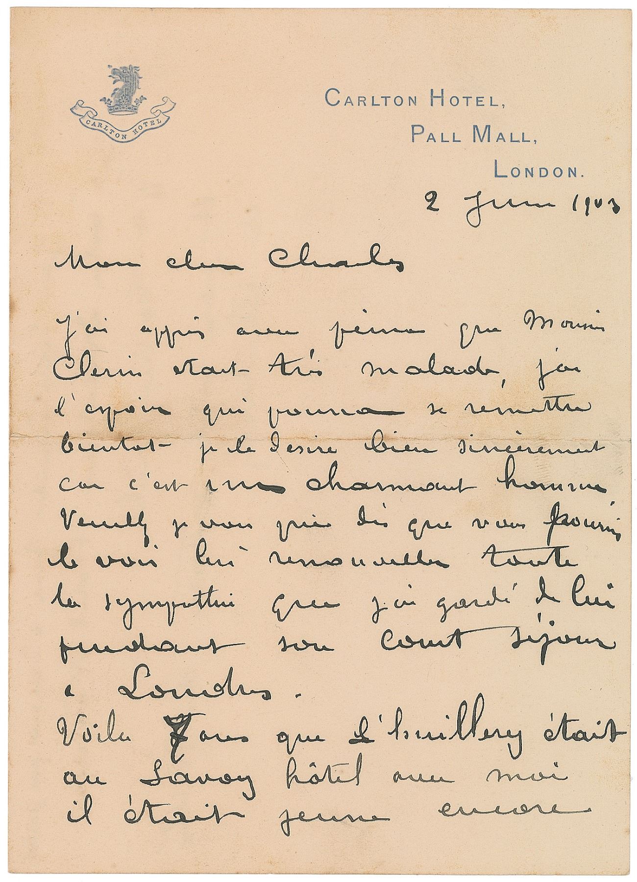 Legendary French chef, restaurateur, and culinary writer (1846–1935) who was one of the most important leaders in the development of modern French cuisine. ALS in French, signed "A. Escoffier," four pages on two adjoining sheets, 5 x 7, Carlton Hotel letterhead, June 2, 1903. Escoffier writes to a gentleman regarding a reference he has supplied for a former assistant at the Savoy. In fine condition.