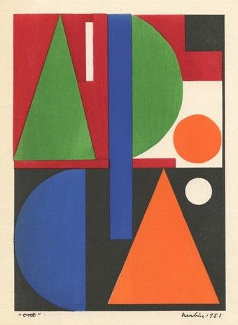 Auguste Herbin "Oui" Pochoir - Printed in Paris for the Temoignages pour l'art abstrait project, published in 1952 by Editions d'Art d'Aujourd'hui, of Boulogne. Sheet size, including margins: 9 1/2 x 7 1/2 inches (240 x 195mm) - Professionally Framed & Matted - Comes With Certificate - -