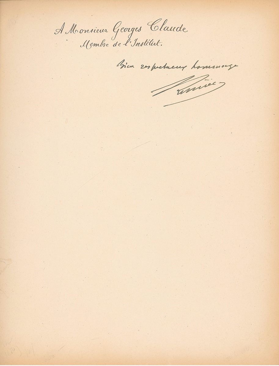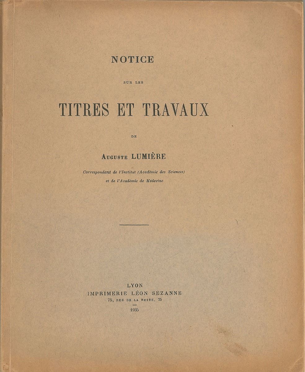 Inventor of photographic equipment (1862–1954) who, with his brother Louis, patented the cinematograph and produced the first-ever motion picture in 1894. Signed book: Notice sur les titres et travaux de Auguste Lumiere. Lyon: Imprimerie Leon Sezanne, 1935. Paperback, 8.5 x 10.75, 285 pages. Inscribed by an unknown hand and signed on the first free end page in fountain pen in French. Toning, slight creasing and soiling to spine and covers, with light pencil notations and paper remnants to signed page, otherwise fine condition.