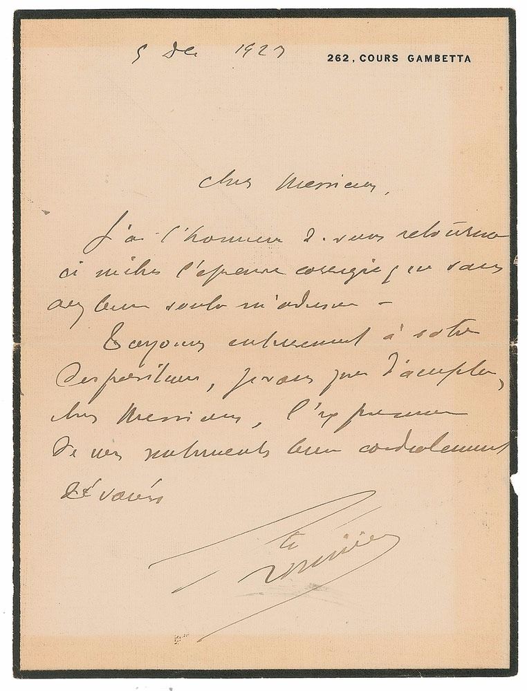Inventor of photographic equipment (1862–1954) who, with his brother Louis, patented the cinematograph and produced the first-ever motion picture in 1894. ALS in French, signed “Ate. Lumiere,” one page, 5.25 x 7, Cours Gambetta letterhead, December 5, 1927. In part (translated): "I have the honor to return to you herewith the corrected proof which you have kindly addressed to me." In fine condition, with toning and slight chipping to edges.