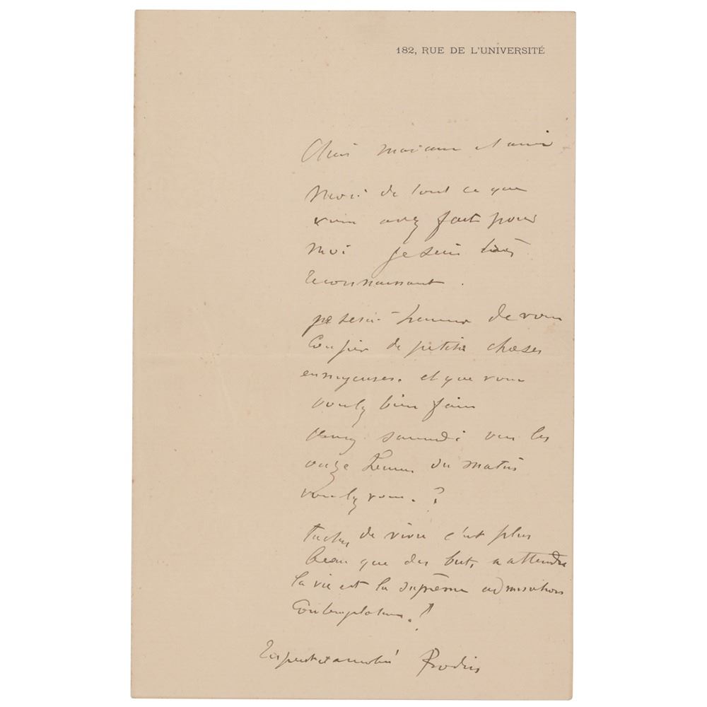 ALS in French, signed “Rodin,” one page, 4.5 x 7, 182 rue de l'Universite letterhead (the address of his studio), no date. Untranslated handwritten letter to a friend. In fine condition.
