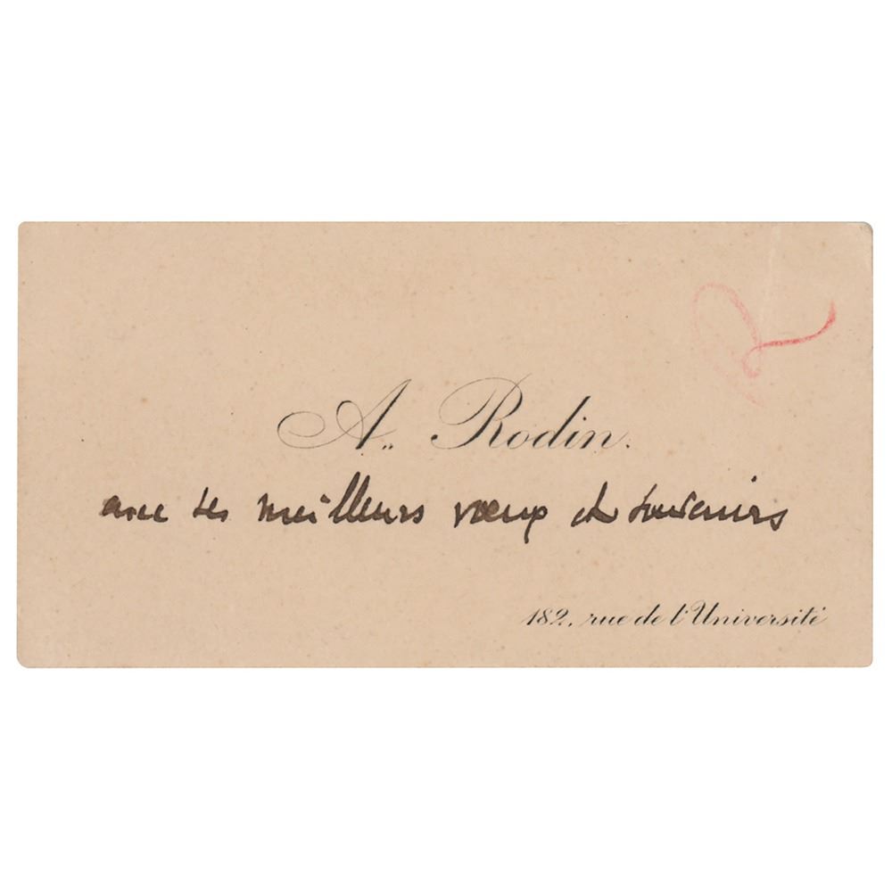 Personal calling card imprinted with Rodin‰Ûªs name and studio address in Paris, 3.5 x 1.75, bearing an unsigned note in French by Rodin. In fine condition, with a partially erased "12" in the upper right blank area.