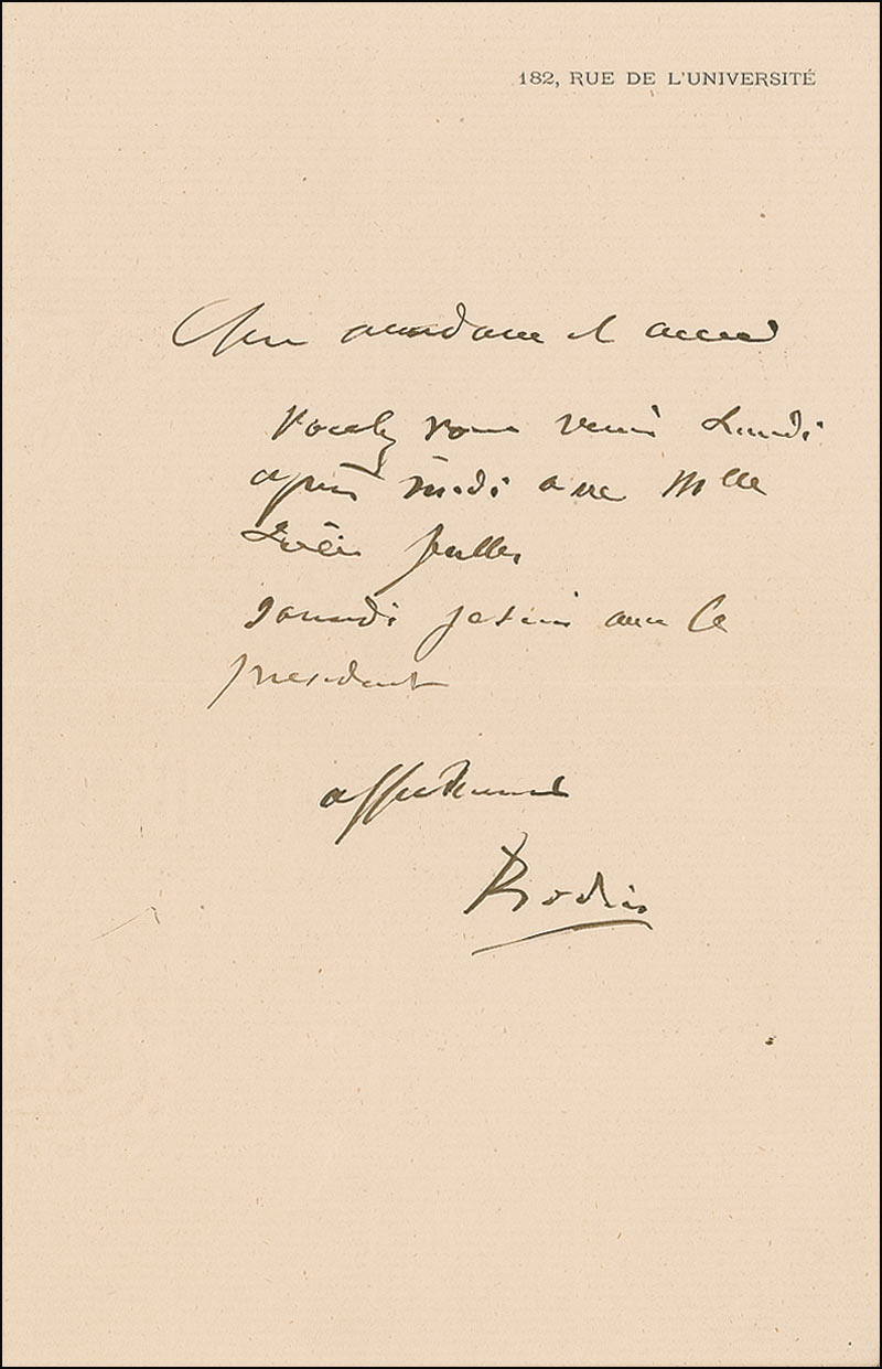 Seminal and highly lauded French sculptor (1840–1917) whose works, including the iconic ‘The Kiss’ and ‘The Thinker,’ earned him a place among the most influential artistic figures of the late 19th and early 20th centuries. ALS in French, signed “Rodin,” one page, 4.5 x 7, personal letterhead, no date, but postmarked April 1909. Letter to Miss Emilia Cimino. Rodin invites a close collaborator to come to see him with the famous American dancer Loïe Fuller. In fine condition, with a central horizontal fold, some scattered light creases, and a uniform shade of toning. Accompanied by the original mailing envelope. Fuller was a great collector of Rodin’s works and was highly influential in introducing the artist and his sculptures to the American public. Rodin referred to her as “an innovative American artist a woman of genius, with all the resources of talent whom I have admired for a number of years.”