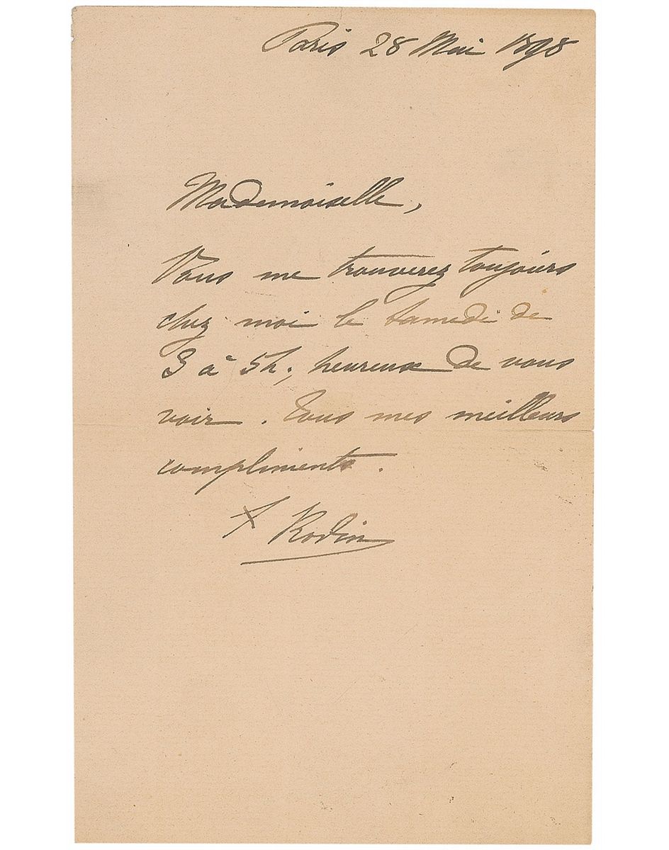 Seminal and highly lauded French sculptor (1840–1917) whose works, including the iconic ‘The Kiss’ and ‘The Thinker,’ earned him a place among the most influential artistic figures of the late 19th and early 20th centuries. ALS in French, signed “A. Rodin,” one page, 4.25 x 7, May 28, 1898. Letter to an unidentified woman, possibly Rodin’s close friend and biographer, Judith Cladel. In full (translated): “You will always find me at my home on Saturday from 3 to 5, glad to see you. All my best compliments.” A partial separation along central horizontal fold, some scattered light soiling and creasing, and a uniform shade of toning, otherwise fine condition.
