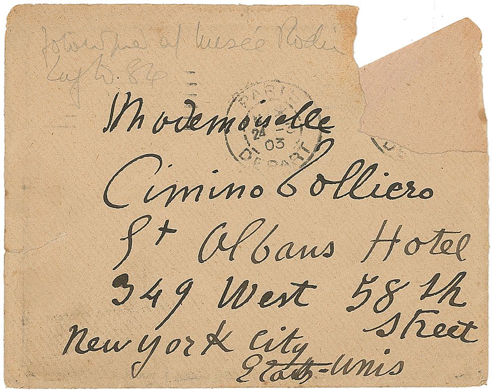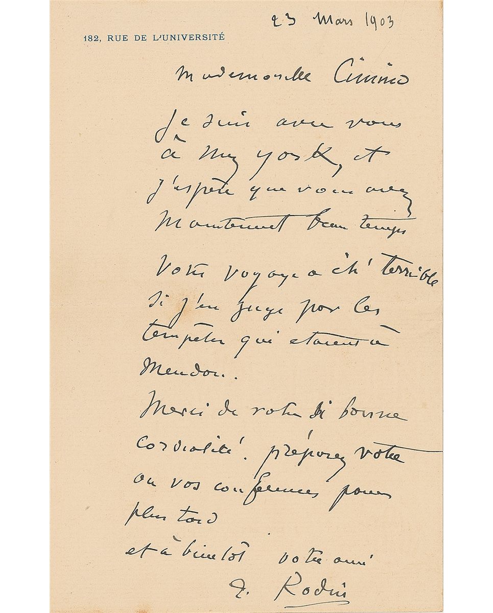 Seminal and highly lauded French sculptor (1840–1917) whose works, including the iconic ‘The Kiss’ and ‘The Thinker,’ earned him a place among the most influential artistic figures of the late 19th and early 20th centuries. ALS in French, signed “A. Rodin,” one page, 4.5 x 7, personal letterhead, March 23, 1903. Letter to “Mademoiselle Cimino,” a close collaborator, Emilia Cimino, who was promoting Rodin’s work in the United States. In full (translated): “I am present with you in New York and hope the weather is now fine. If I judge from the tempests in Meudon your trip must have been terrible. Thank you for your help and friendship and do prepare your conferences later.” In fine condition, with a bit of scattered light toning. Accompanied by the original mailing envelope.