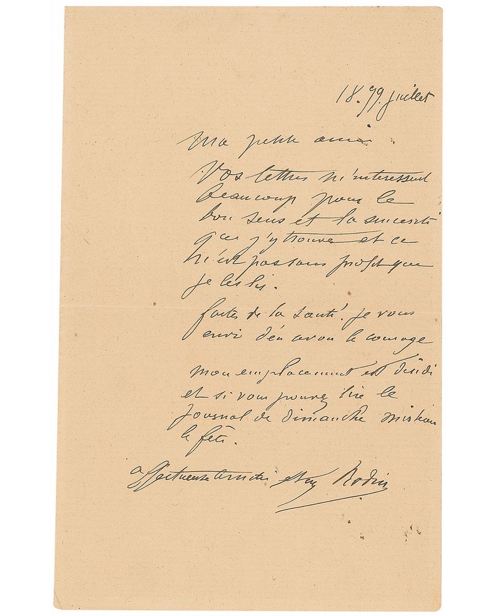 ALS in French, signed “Aug. Rodin,” one page, 4.25 x 6.75, July 18, 1899. Written to his collaborator Emilia Cimino, regarding the unveiling of his statue ‘Eve.’ In fine condition. Accompanied by the original mailing envelope. Cimino was also an artist and spent time with Rodin in his studio.
