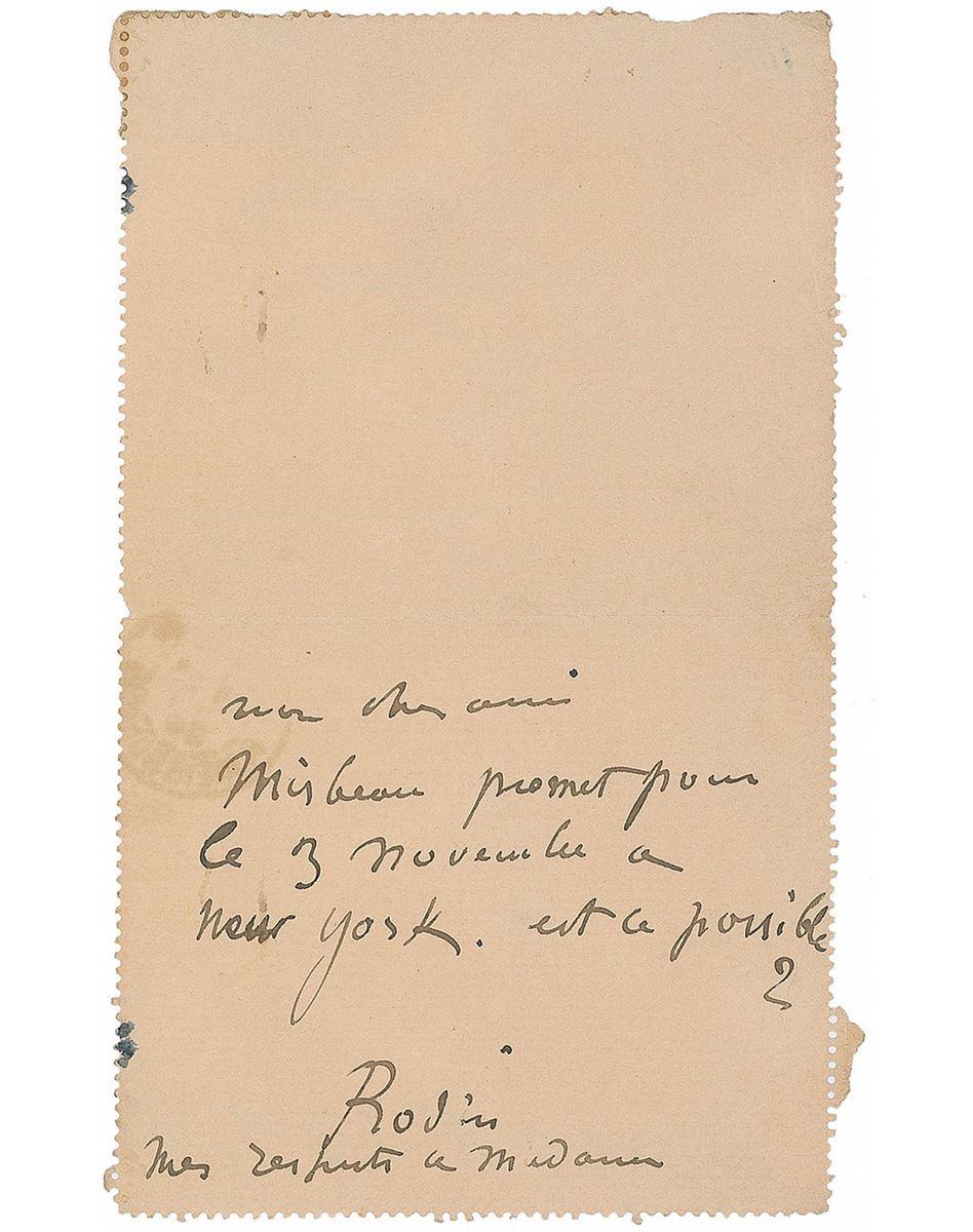 ALS in French, signed “Rodin,” one page, 3.5 x 3, no date, but postmarked October 22, 1899. Letter to American painter John Alexander. In full (translated): “My dear friend, Mirbeau promises for the 3rd November. Is this possible?” Under his signature, Rodin adds, “My respects to Madame.” Rodin has also addressed the integral address panel to Alexander, “artiste peintre.” In fine condition, with a few scattered creases and some light show-through from cancellations on reverse.
