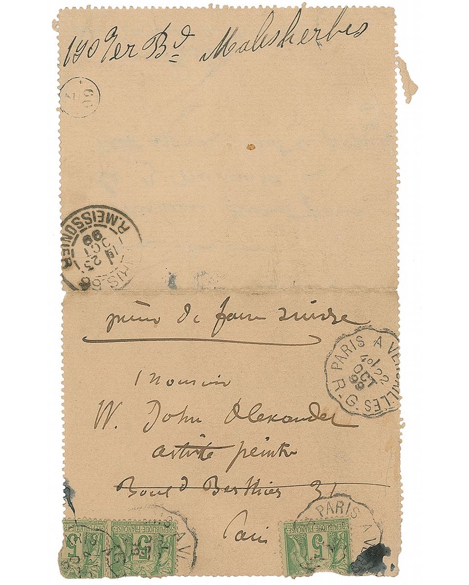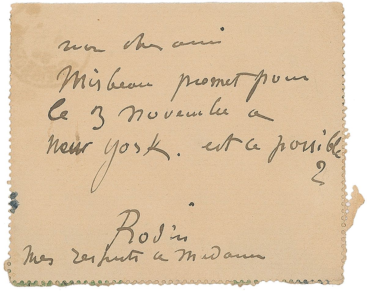 ALS in French, signed “Rodin,” one page, 3.5 x 3, no date, but postmarked October 22, 1899. Letter to American painter John Alexander. In full (translated): “My dear friend, Mirbeau promises for the 3rd November. Is this possible?” Under his signature, Rodin adds, “My respects to Madame.” Rodin has also addressed the integral address panel to Alexander, “artiste peintre.” In fine condition, with a few scattered creases and some light show-through from cancellations on reverse.