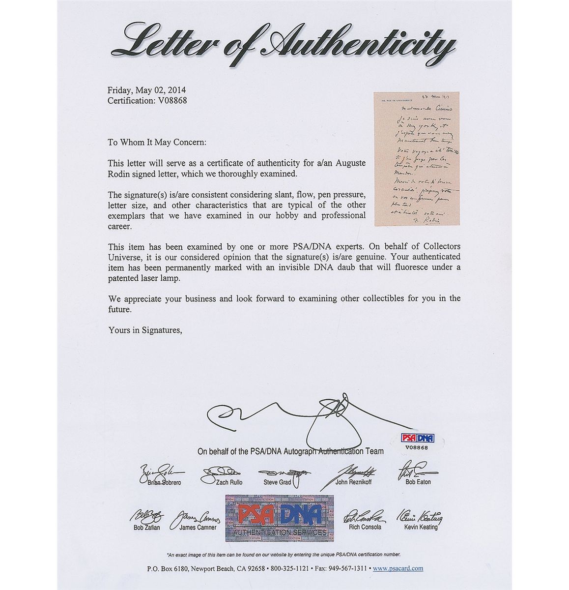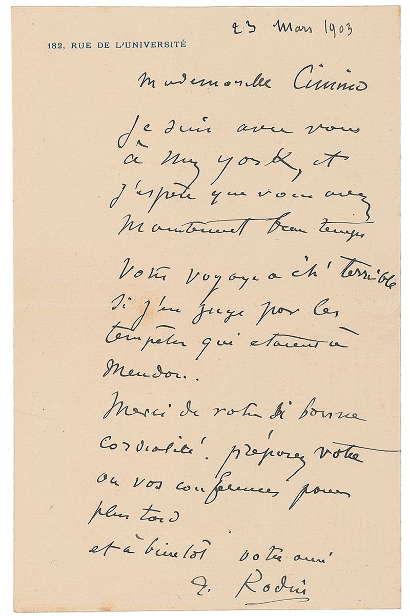 ALS in French, signed “A. Rodin,” one page, 4.5 x 7, personal letterhead, March 23, 1903. Letter to his longtime friend, fellow artist, and one-time model, Emilia Cimino. In full (translated): “I am with you in New York, and I hope that you have nice weather now. Your trip has been terrible if I can judge by the storms that were in Meudon. Thank you for being so cordial! Prepare your conference or conferences for later, and see you soon.” In fine condition. Accompanied by the original hand-addressed mailing envelope and a full letter of authenticity from PSA/DNA. In 1895, Rodin purchased his villa in Meudon, a town about five miles outside of Paris, where he would carry out his most essential creative work. A bold, choice letter from the renowned sculptor.
