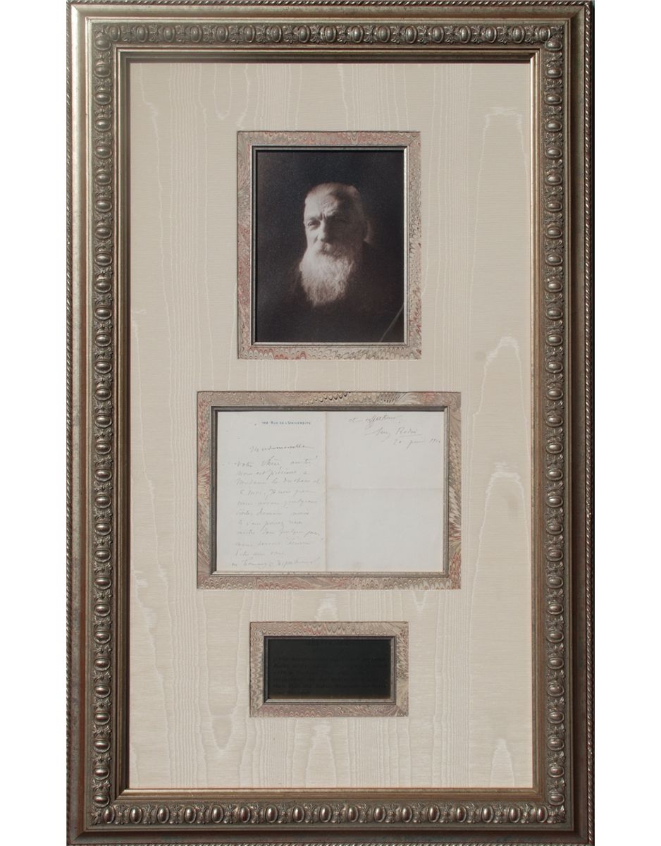 A wonderful handwritten letter, in French, on French sculptor Auguste Rodin's personal stationery. The letter is dated June 20, 1911. Rodin writes in part: " ... Your dear friendship is precious to her Grace the Duchess and myself. think that we have some visits for tomorrow, but if you can invite us in a few days, we will be happy to be with you ... Auguste Rodin." The year that this letter was written was an important one for Rodin as it was then that the Rodin Museum In Paris was founded. Lovely presentation in cream moire hand wrapped silk and framed in pewter with an archival photograph of the artist. A full museum conservation framing has been employed to preserve and protect this piece.