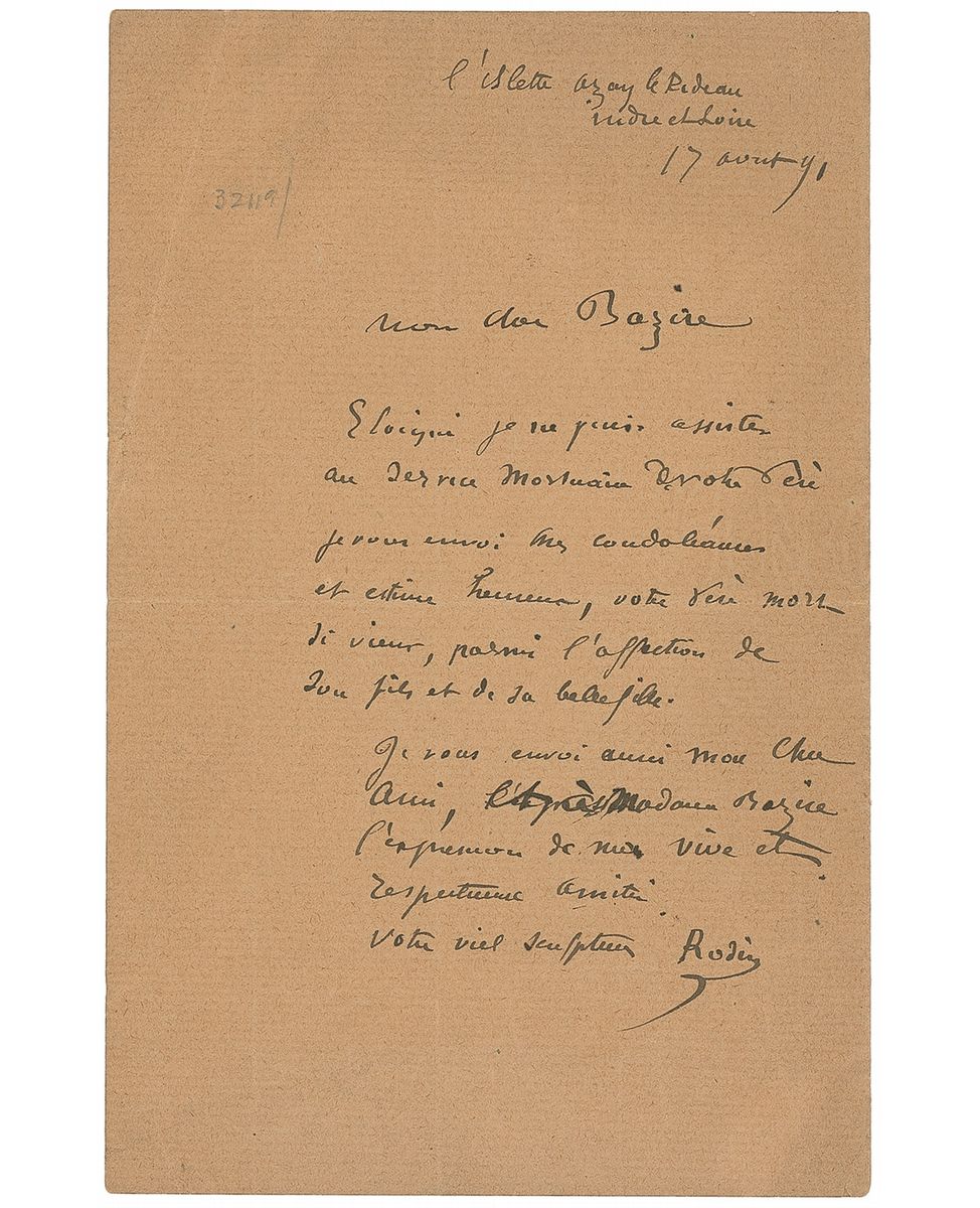 ALS in French, signed “Votre vieil sculpteur [Your old sculptor], Rodin,” one page, 4.5 x 7, August 17, 1891. Letter offering condolences to journalist Edmond Bazire, whose father had just died. In part (translated): “From distance I can not attend the mortuary service of your father…I also sent you my dear friend, and Mrs. Bazire express my deep and respectful friendship.” Uniform toning, otherwise fine condition. In 1883, Bazire had advised Rodin to make a portrait of a famous man to help establish his own reputation, and introduced him to Victor Hugo. Although Hugo refused to pose at sittings, he allowed Rodin to visit and make preliminary sketches. Rodin was able to complete the bust in 1883, two years before Hugo’s death. A desirable association piece.
